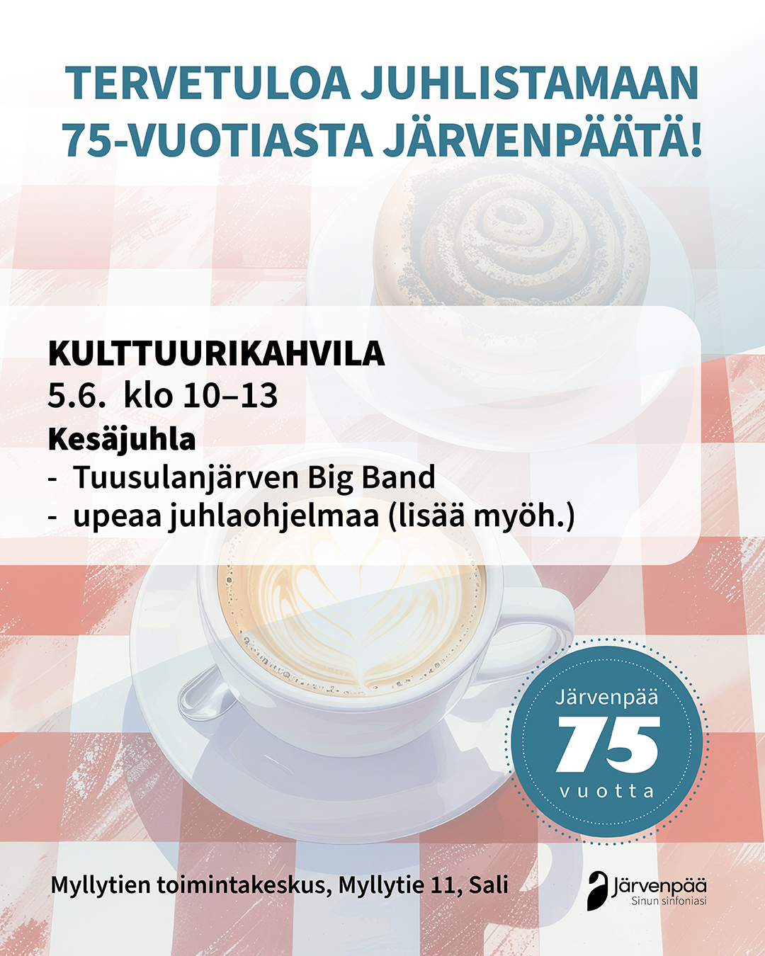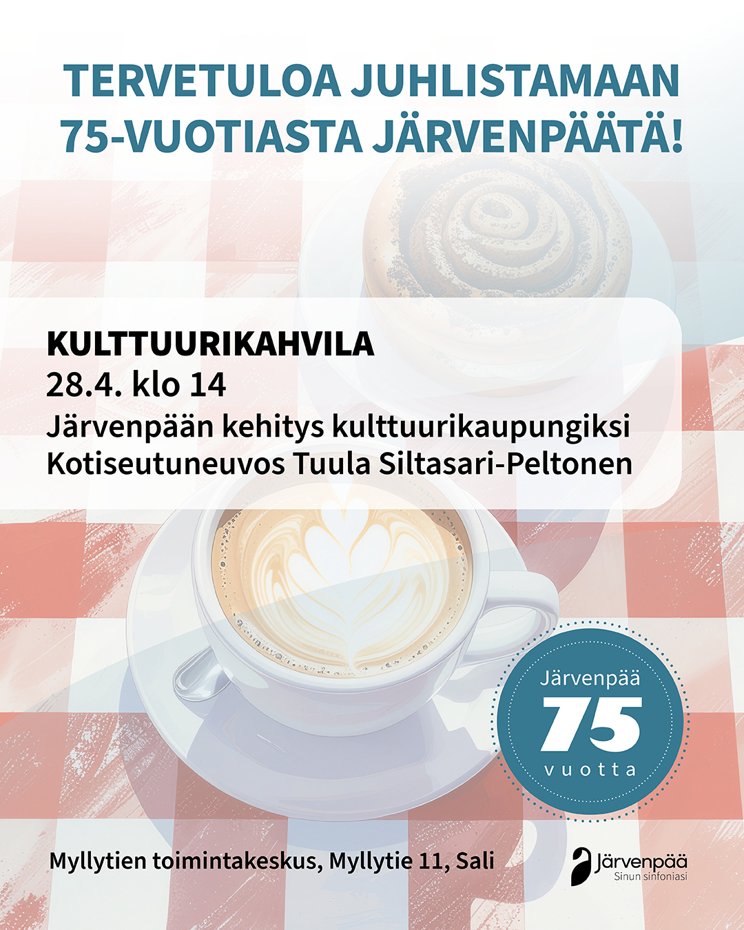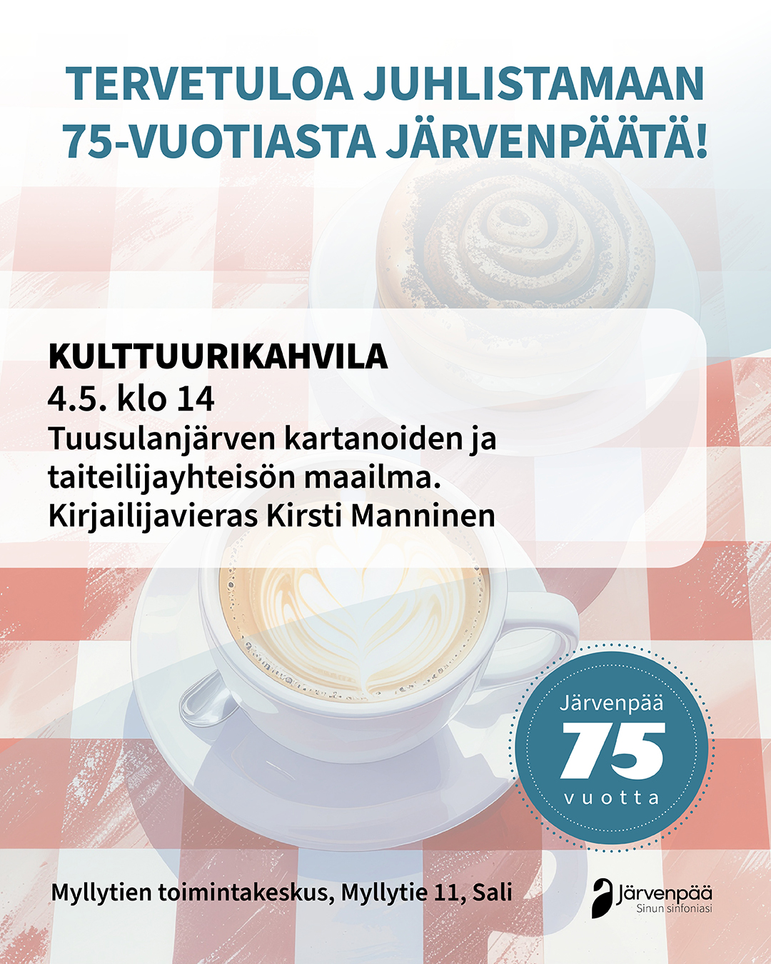 Järvenpään juhlavuoden kulttuurikahvila tapahtumia kevään aikana. Upeita vieraita tulossa ja kaikki tilaisuudet ovat avoimia ja maksuttomia.
