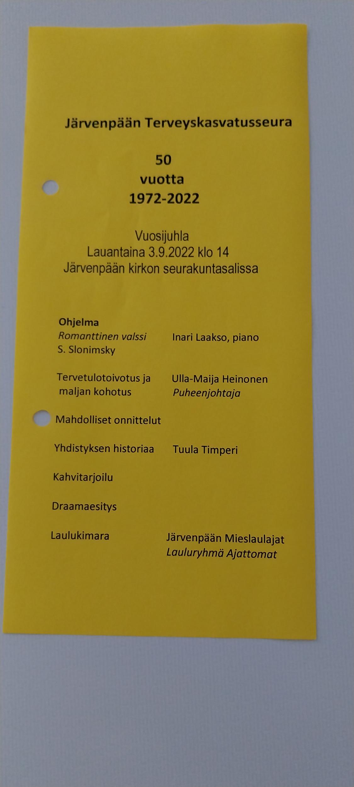 50-vuotisjuhla pidettiin la 3.9. klo 14–17, Järvenpään Seurakuntakeskuksessa. Tilaisuus onnistui suunnitelman mukaisesti, ohjelma kattava ja siitä pidettiin. Tilaisuuteen osallistui yksi kunniajäsen ja n. 80 jäsentä.