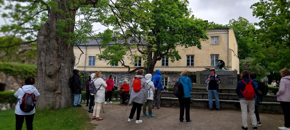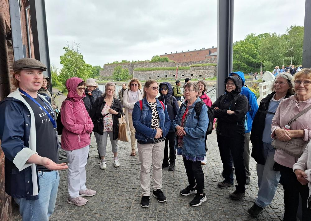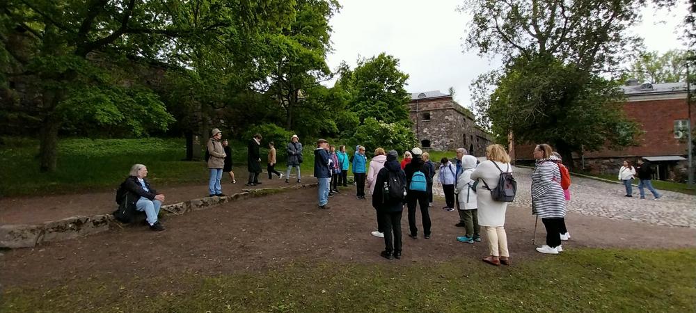 Takaisin Kauppatorin rantaan ja sieltä Suomenlinnan paatilla Unescon maailmanperintökohteeseen Suomenlinnaan. Heti saavuttuamme nautimme lounaan, jonka jälkeen meidät jaettiin kahteen ryhmään ja oppaan johdolla kuljimme muutamiin merkittäviin kohteisiin mm. Suomenlinnan telakka, suuri linnanpiha ympäröivine rakennuksineen on linnoituksen vanha hallinnollinen keskus, jossa Suomenlinnan perustajan Augustin Ehrensvärdin viimeinen leposija ja hautamuistomerkki. Mukulakivikatu oli monelle huonojalkaisille haasteellinen, mutta kaikki pääsivät perille. Muutamat kävivät Ehrensvärdin museossa, kirkkoa ihastelimme vain ulkoa päin, sinne olisi pitänyt maksaa pääsylippu. Retken lopuksi nautimme iltapäiväkahvit ennen siirtymistämme paluulautalle.