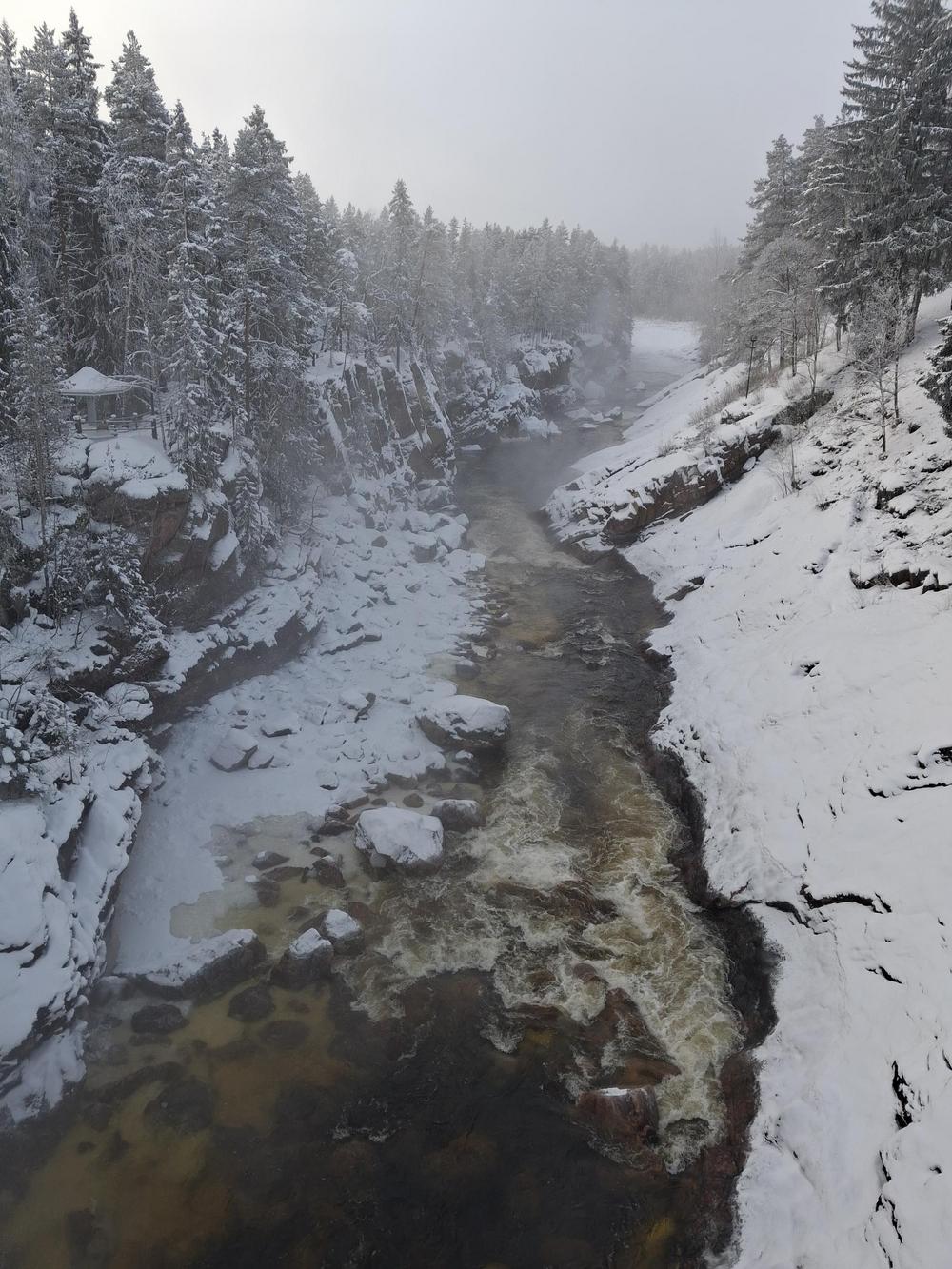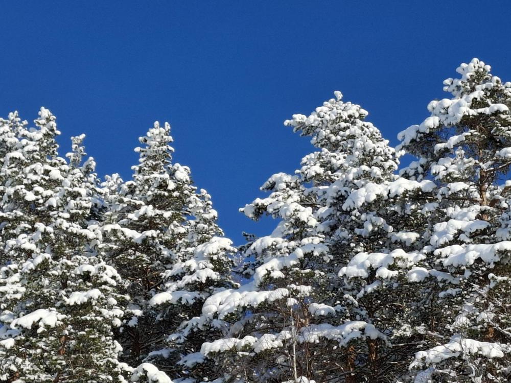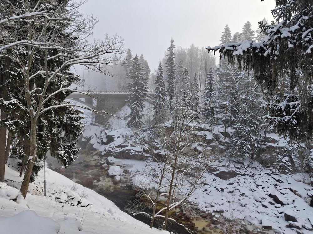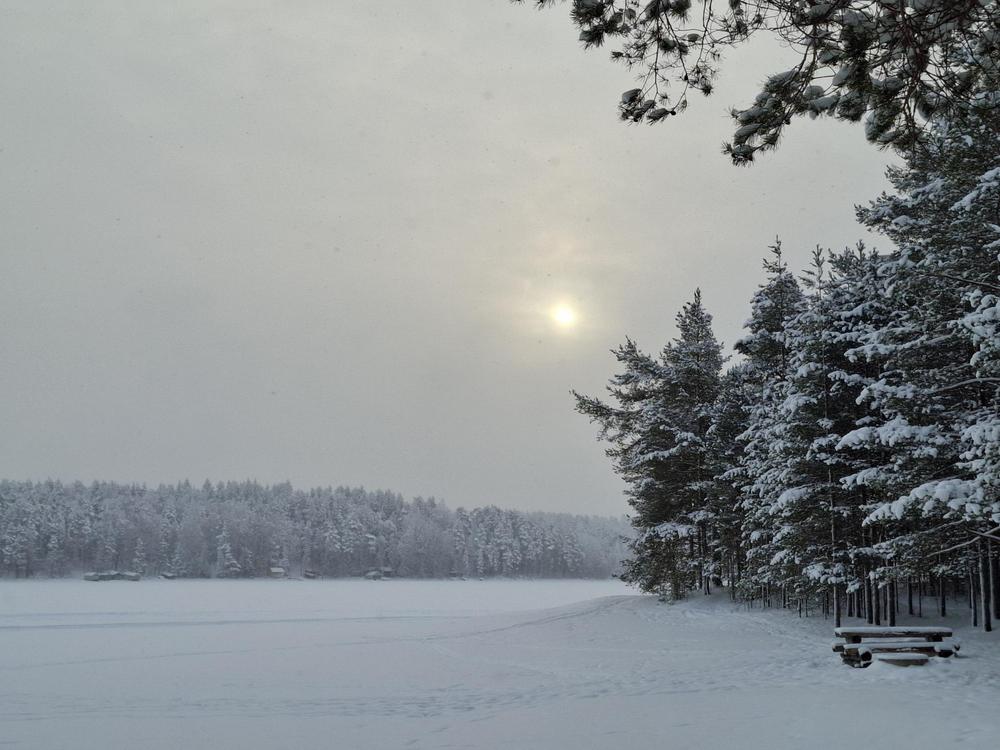 Ilma oli kirpeä. Pakkasta oli aamuisin yli 20 astetta, mutta se ei meitä haitannut. Satumaisen kauniissa maisemassa nautimme kävellen jäällä sekä metsässä.